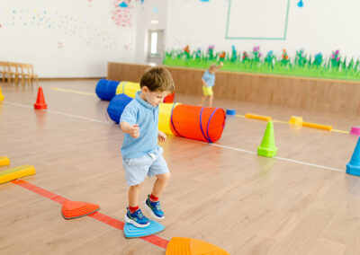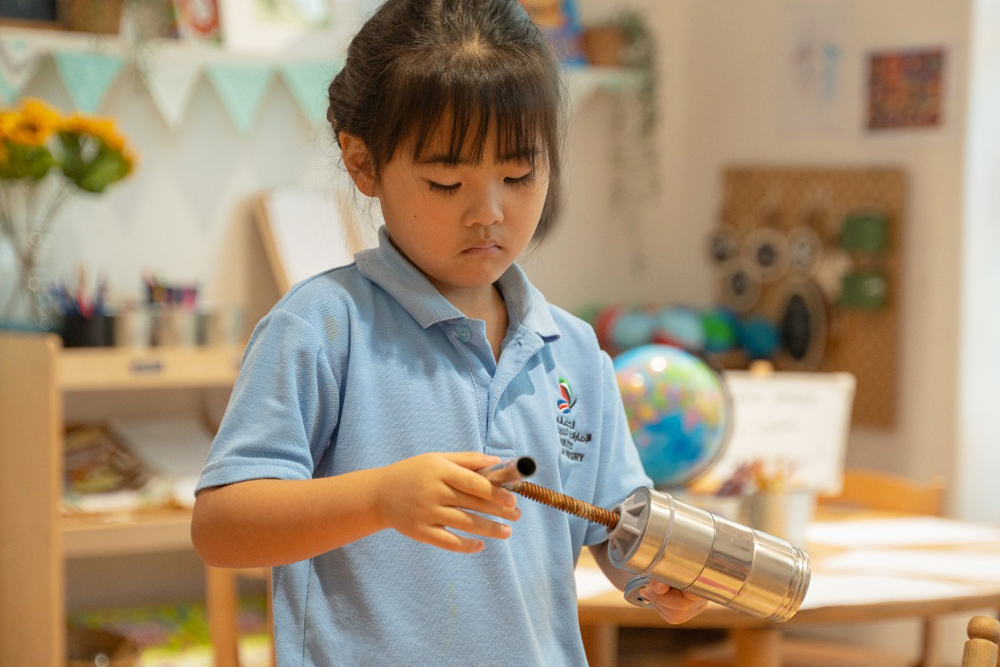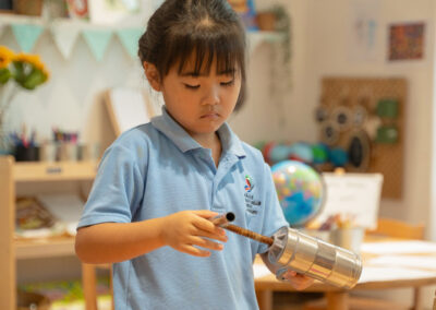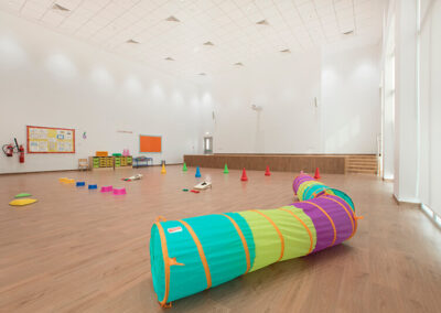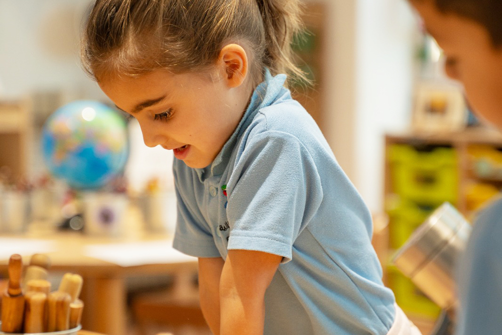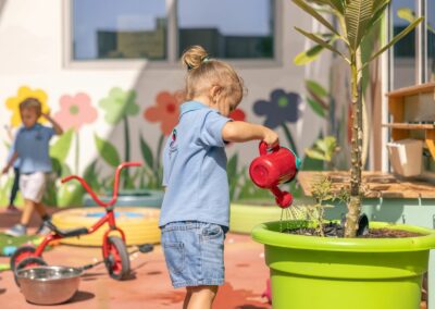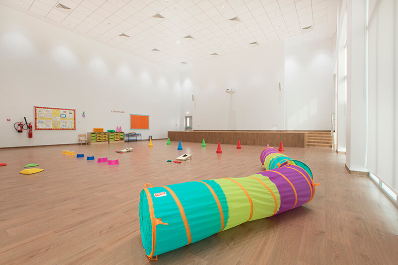 Our light and bright classrooms are equipped with child-safe wooden furniture and stimulating resources which encourage the children to explore and learn through play. We also have a range of activity rooms for the children to explore, the library for storytelling with a focus on developing literary skills. A Discovery Room, where young learners become explorers, scientists, and engineers and boasts a creative corner that includes an interactive space for self-directed exploration! The soft room is a purpose built area allowing the children to interact and explore while developing coordination skills! The large auditorium is filled with floor to ceiling natural light and is used throughout the year to accommodate daily physical activities with the use of yoga mats, bouncy gym balls, and a kids balance beam, with a projector for important concerts and community events. The Role-play room is an interactive sustainable village and transforms imaginations and encourages interaction and communication as the children engage in pretend pay with their friends.